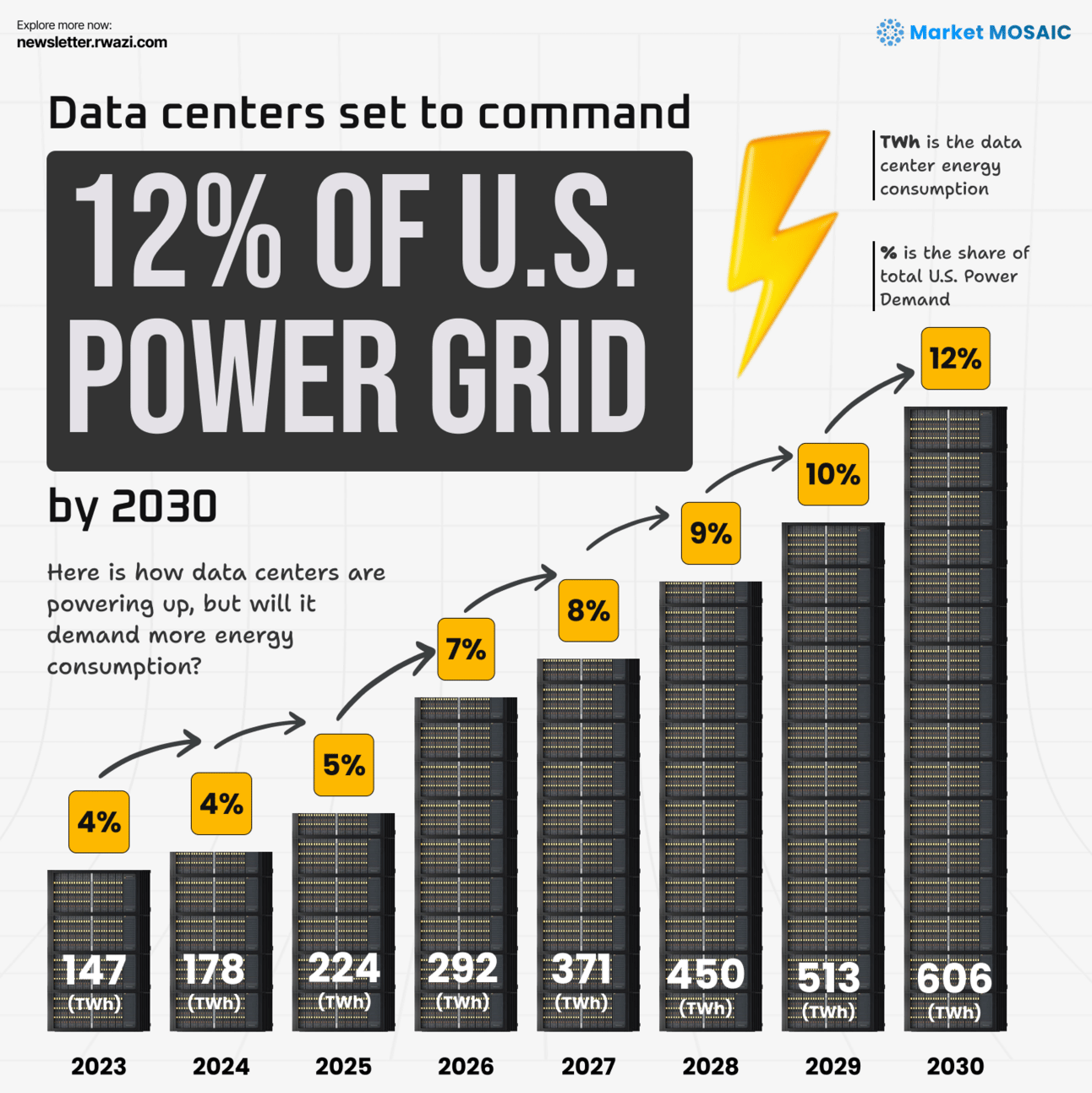 The digital transformation driving consumer experiences comes with a massive hidden cost: energy consumption. And according to analysis by Market Mosaic, data centres in the United States will consume 606 terawatt-hours of energy, 12% of the nation's power by 2030, up from just 3% today, equivalent to powering 57 million homes annually.