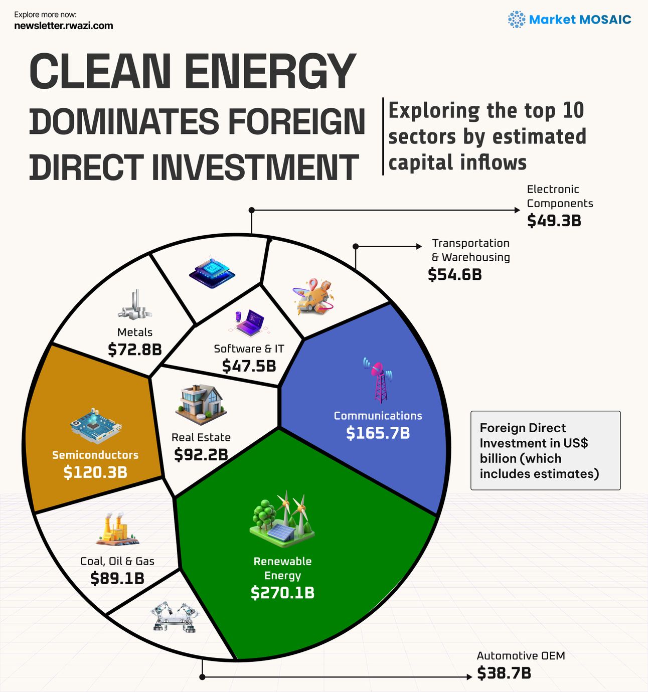 Data analysis by Market Mosaic has shown that global Foreign Direct Investment (FDI) now has a strategic shift toward long-term structural sectors, with renewable energy maintaining its dominance by attracting $270.1 billion and retaining the top position for six consecutive years despite a decline in mega-projects.
