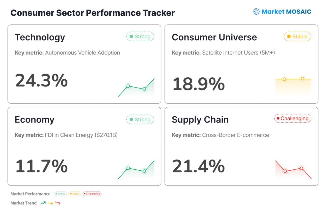Now, as usual, welcome to Market Mosaic, where, in this week's edition, we explore the collision of consumer caution and technological advancement across transportation and analyse the satellite internet that's connecting 350 million previously unreachable consumers while Asian logistics companies challenge delivery standards.
