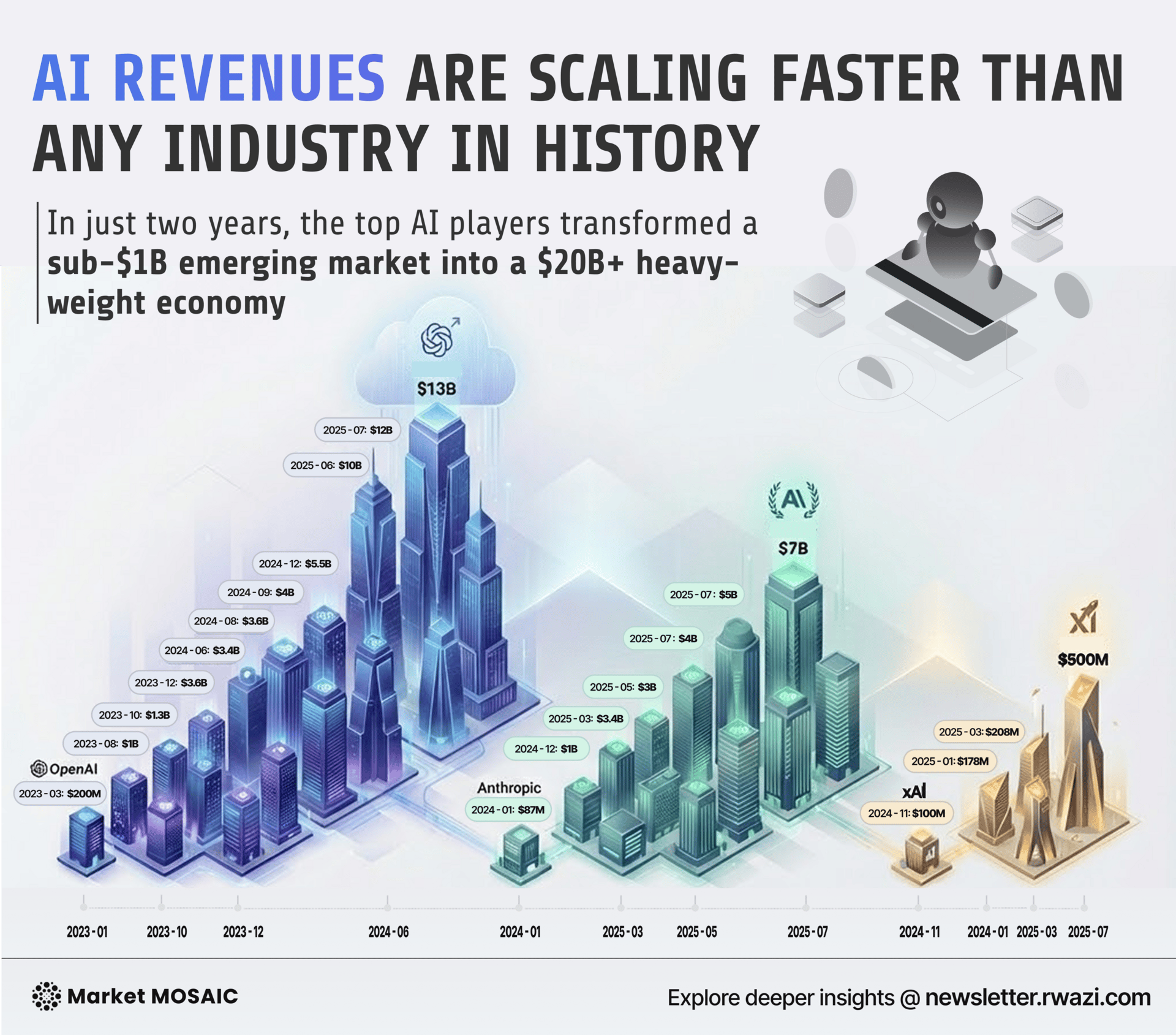 The AI sector is experiencing explosive revenue growth that defies traditional patterns. OpenAI has surged to $13 billion in annualised revenue by August 2025, up from $200 million in early 2023, a 65-fold increase in just over 2 years.