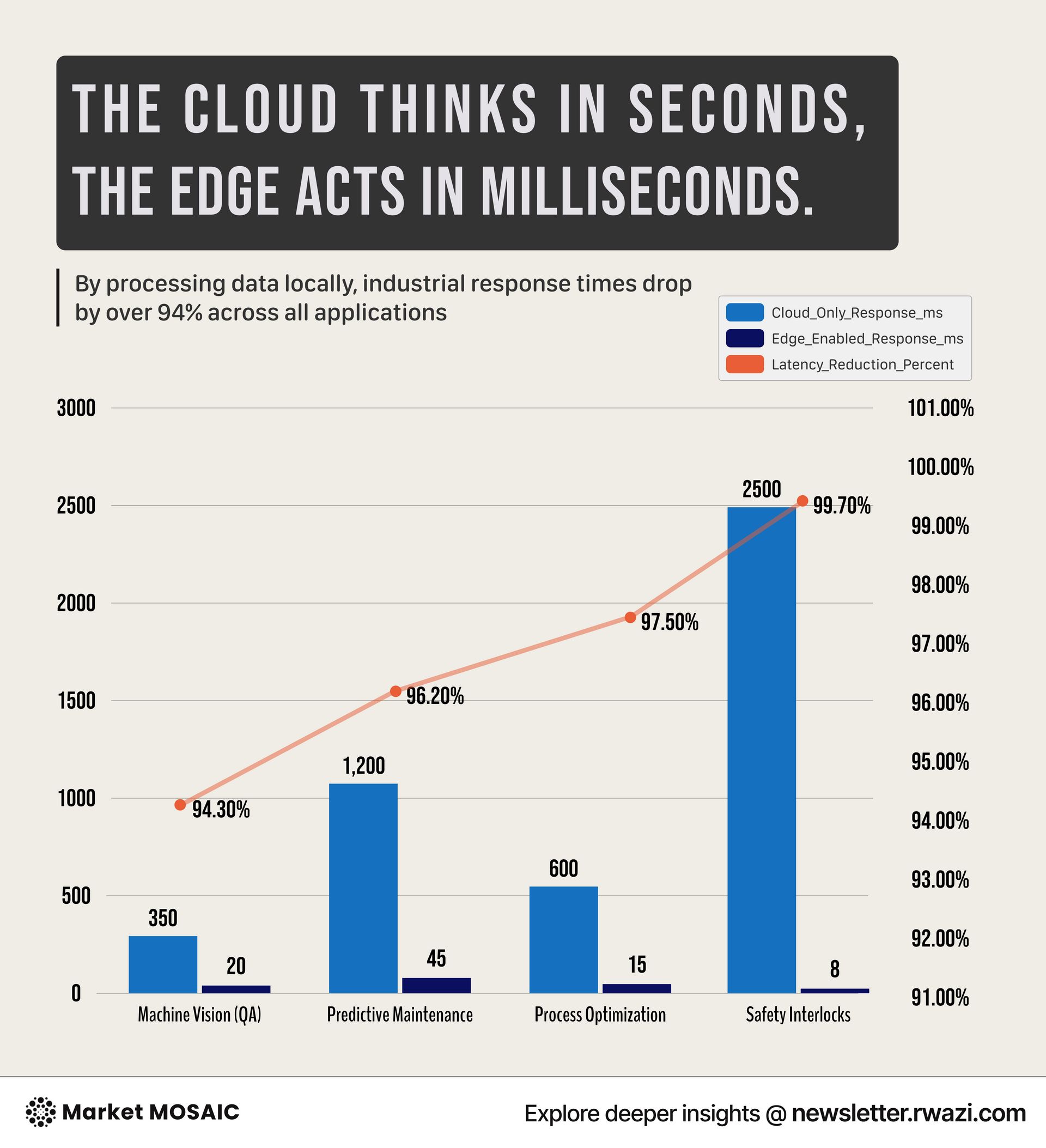 Our analysis of the new industrial edge architecture reveals a massive performance gap that will drive this migration. In Safety Interlocks, the cloud takes a dangerous 2,500 milliseconds to react. Edge systems cut this to just 8 milliseconds—a 99.7% reduction that essentially eliminates risk.